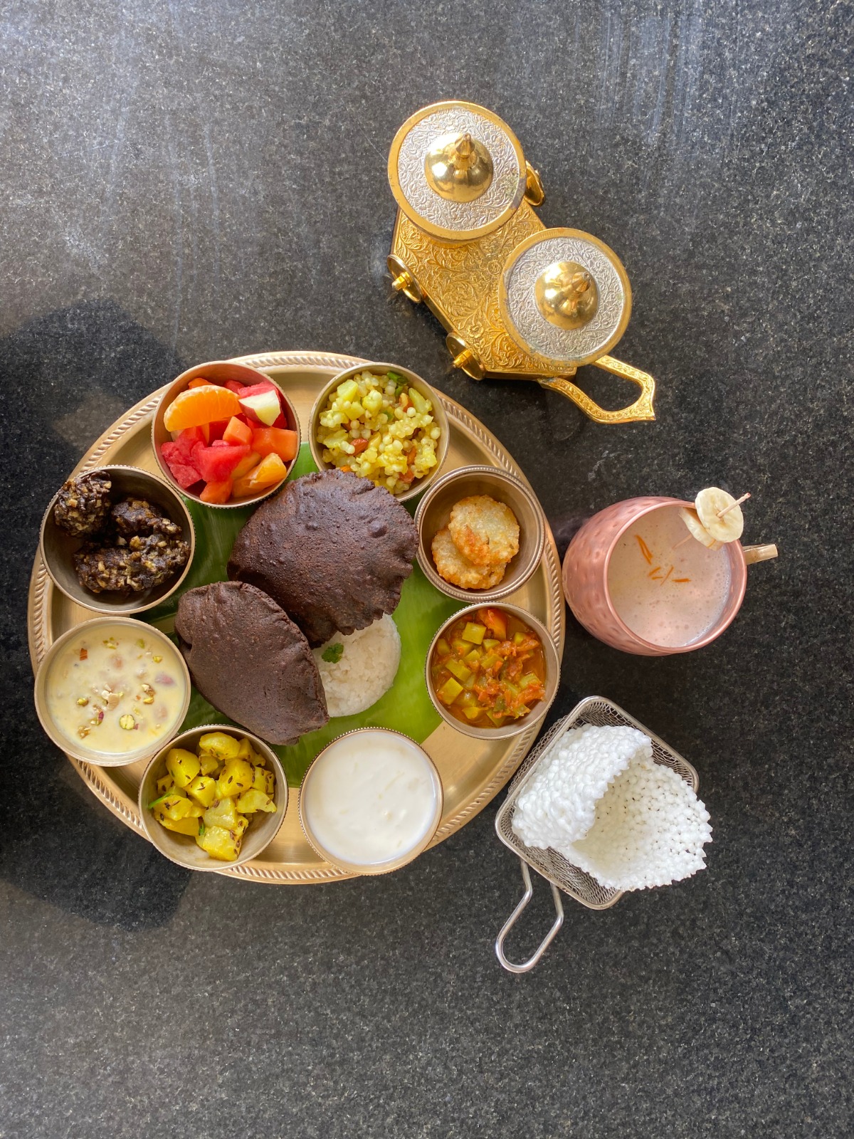 शेरेटन ग्रैंड पैलेस के इस खास मेन्यू में ड्रिंक्स में बनाना शेक और स्टार्टर के रूप में साबूदाना वड़ा, आलू कुट्टू पकोड़ा शामिल हैं। मुख्य कोर्स में साबूदाना खिचड़ी, आलू टमाटर रसा या लौकी टमाटर की सब्जी, आलू जीरा, फ्रूट सलाद, पाइनएप्पल रायता, कुट्टू पूरी, सामक के चावल, साबूदाना पापड़ और भोजन के अंत में मिठाई के रूप में मखाने की खीर है।