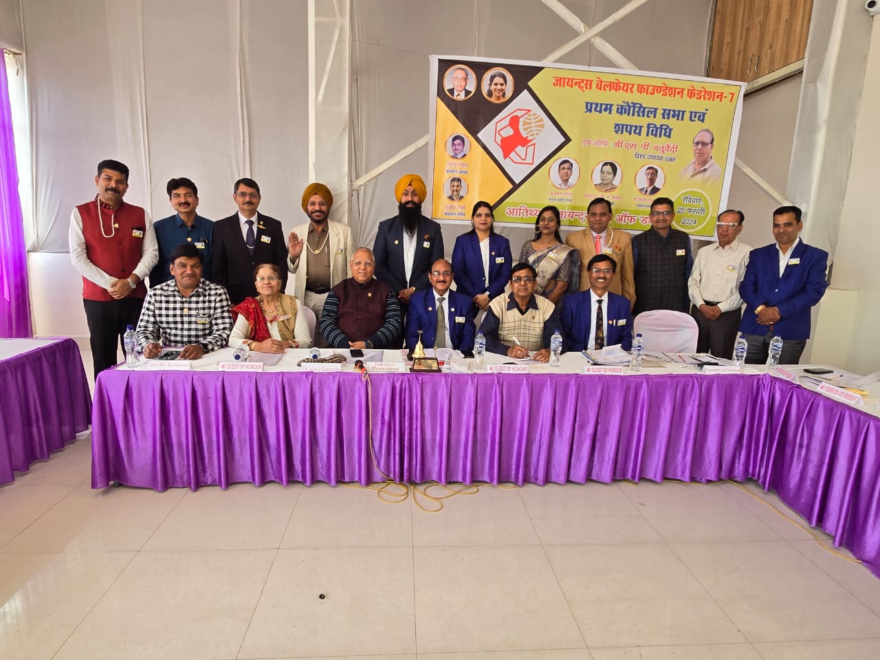 इंदौर  । जायंट्स वेलफेयर फाउंडेशन के फेडरेशन सेवन के नवनियुक्त कौंसिल सदस्यों का शपथ विधि समारोह ग्वालियर जिले के डबरा स्थित जय शिव गार्डन पर विश्व उपाध्यक्ष एसपी चतुर्वेदी के मुख्य आतिथ्य एवं सेंट्रल कमेटी के वरिष्ठ सदस्य श्याम गोयल के विशेष आतिथ्य और फेडरेशन के अध्यक्ष नरेंद्र मंगल की अध्यक्षता में संपन्न हुआ।