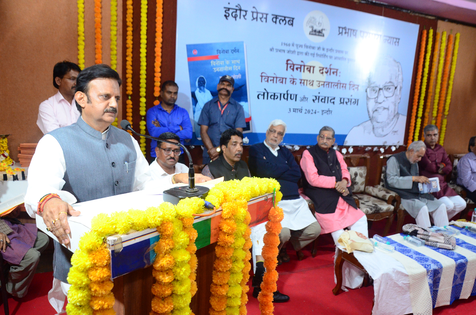 इंदौर प्रेस क्लब अध्यक्ष अरविंद तिवारी ने स्वागत उद्बोधन देते हुए कहा कि ‘विनोबा दर्शन : विनोबा के साथ उनतालीस दिनÓ पुस्तक एक ऐसा संग्रहणीय दस्तावेज है, जो नई पीढ़ी को जरूर पढऩा चाहिए। आचार्य विनोबा जी जब इंदौर प्रवास पर थे, उस समय यहां की आबाद मात्र चार लाख थी और समय उन्होंने इंदौर को स्वच्छ करने का बीड़ा उठाया था। जो आज साकार हो चुका है।
