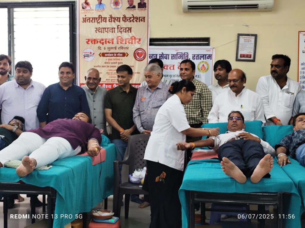रतलाम । आज हर व्यक्ति को मानव हित में रक्तदान करना चाहिए ताकि किसी की तकलीफो को दूर कर सके । रक्तदान के लिए अभी भी कुछ लोगों के मन मे कई भ्रांतीया है उसको हमे दूर करना होगा । अंतरराष्ट्रीय वैश्य फेडरेशन द्वारा यह कार्य मानवता की भलाई है , मेरा इसमें जो भी योगदान होगा वह देने का पुरा प्रयास करूंगा । उक्त विचार मंडल रेल प्रबंधक अश्विन कुमार ने अंतरराष्ट्रीय वैश्य फेडरेशन के स्थापना दिवस पर रतलाम इकाई स्वागत मानव सेवा समिति मे आयोजित रक्तदान शिविर के अवसर पर व्यक्त किए ।