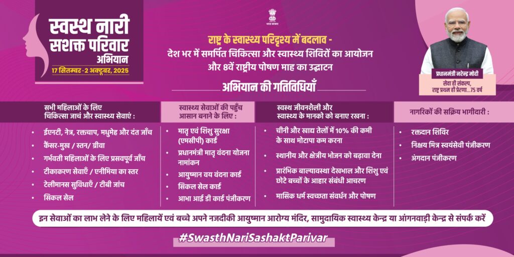 अभियान के दौरान गर्भवती महिलाओं की गुणवत्तापूर्ण प्रसव पूर्व जांच एवं अनमोल 2.0 में प्रविष्टि , किशोरियों में एनीमिया स्क्रीनिंग उपचार एवं आहार संबंधी परामर्श एवं आवश्यकता होने पर उमंग क्लीनिक पर रेफरल , गर्भवती महिला और शिशु बच्चों में टीकाकरण स्तर की जांच एवं छूटे हुए बच्चों का टीकाकरण पूर्ण किया जाना , गैर संचारी रोग उच्च रक्तचाप ,मधुमेह , कैंसर मुख , स्तन एवं गर्भाशय ग्रीवा कैंसर की जांच , स्वस्थ यकृत मिशन अंतर्गत बीएमआई जांच , एनीमिया परीक्षण एवं परामर्श , टी बी रोग स्क्रीनिंग , सिकल सेल की स्क्रीनिंग तथा जेनेटिक काउंसलिंग कार्ड का वितरण , मानसिक स्वास्थ्य स्क्रीनिंग, मोतियाबिंद , कांच बिंद, दंत रोग , बधिरता , श्रवण विकार , किशोरियों एवं महिलाओं के लिए पोषण मासिक धर्म स्वच्छता , विद्यालय एवं महाविद्यालय छात्रों के सहयोग से अभियान चलाकर खाद्य तेल की खपत 10% कम करना , पोषण माह के अंतर्गत आयोजित गतिविधियों को जागरूकता अभियान ईट टू राइट अभियान संबंधी गतिविधियों से जोड़ा जाएगा। अभियान के दौरान स्वेच्छिक रक्तदान शिविर का आयोजन विभिन्न सामाजिक संस्थाओं के सहयोग से किया जाएगा।
