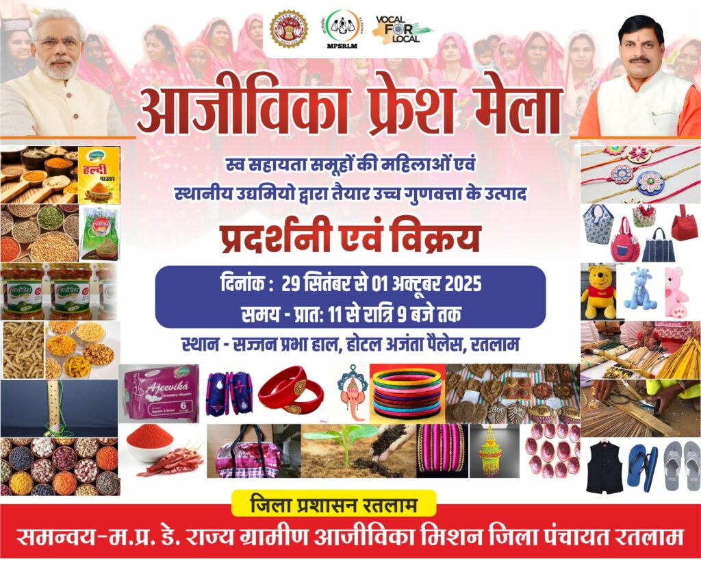 रतलाम 28 सितंबर । जिला प्रशासन द्वारा पंचायत एवं ग्रामीण विकास विभाग, म.प्र. शासन अंतर्गत म.प्र. डे राज्य ग्रामीण आजीविका मिशन एवं शासन अंतर्गत विभिन्न योजनाओं में गठित स्व सहायता समूहों द्वारा तैयार विभिन्न उत्पादों के प्रदर्शन एवं विक्रय हेतु 03 दिवसीय आजीविका फ्रेश मेले का आयोजन 29 सितंबर से 01 अक्टूबर तक सज्जन प्रभा हॉल, अजन्ता पेलेस रतलाम में जिला स्तर पर किया जा रहा है। मेले में स्व सहायता समूहों द्वारा संगठनों एवं बैंको से ऋण लेकर विभिन्न प्रकार के उत्पाद तैयार किये जा रहे है एवं विभिन्न माध्यमों से विक्रय किया जा रहा है जिसमें रेशम चूडी, ब्लॉक प्रिंटिंग चादर, मसाले, दाले, पेंटिंग, ज्वार, बाजरा, मक्का का आटा, अचार, टमाटर लहसुन की चटनी, चिप्स, छोटी फेंन्सी झाडू, स्लीपर एवं फैंसी चप्पल, लाख की चूड़ियां, नमकीन, आयटम, भगवान की पोशाक, बांस के विभिन्न फैन्सी आईटम, छीपक, धूपबत्ती, रूई की बाती, सॉफ्ट टॉय, अगरबत्ती, झूमर आदि प्रमुख है।