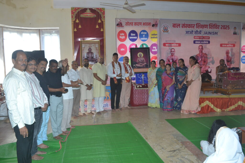 तीसरे दिन बाल संस्कार शिक्षण शिविर 20 25 आओ सीखे दिनेश जैनिज्म का शुभारंभ भगवान महावीर स्वामी के चित्र के समक्ष दीप प्रज्वलन मुख्य अतिथि मनीष जैन तहसीलदार एवं एडवोकेट सुनील जैन द्वारा किया गया तत्पश्चात समिति द्वारा सभी मुख्य अतिथियों का स्वागत मोतियों की माला, दुपट्टा व पगड़ी पहनकर किया गया। मुख्य अतिथियों ने महाराज श्री के चरणों में श्रीफल रखा।