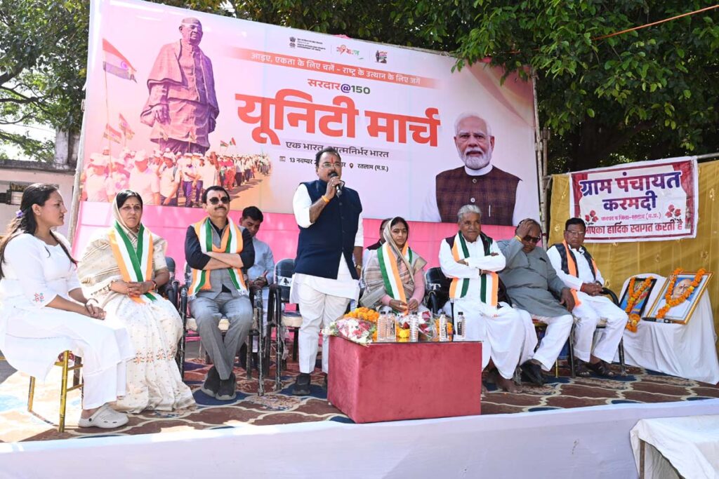 रतलाम 13 नवंबर। सरदार वल्लभभाई पटेल की 150वीं जयंती पर देश भर में यूनिटी मार्च एक भारत-आत्म निर्भर भारत की थीम पर पदयात्राए आयोजित की जा रही है। उसी तारतम्य में आज 13 नवबंर को रतलाम मे सांसद श्रीमती अनिता नागर सिंह चौहान के नेतृत्व में पदयात्रा का आयोजन किया गया। यात्रा मार्ग पर आमजन द्वारा पुष्प वर्षा कर भव्य स्वागत किया गया। यात्रा मे विधायक रतलाम ग्रामीण श्री मथुरालाल डामोर, महापौर श्री प्रहलाद पटेल, जिला अध्यक्ष प्रदीप उपाध्याय, जिला पंचायत अध्यक्ष श्रीमती लालाबाई शंभुलाल चंद्रवंशी, नगर निगम अध्यक्ष श्रीमती मनीषा शर्मा, जनपद पंचायत रतलाम अध्यक्ष संगीता जायसवाल, मनोहर पोरवाल, बजरंग पुरोहित, प्रवीण सोनी, अनिता कटारिया सहित जनप्रतिनिधि एवं नागरिकगण उपस्थित थे।
