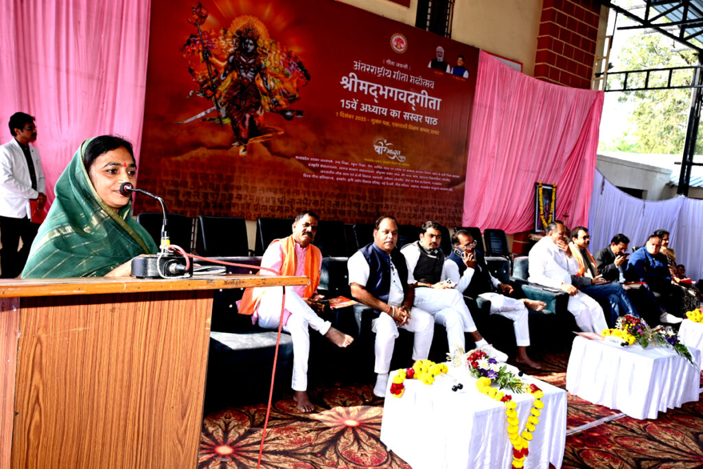 कार्यक्रम को संबोधित करते हुए सांसद श्रीमती अनीता नागर सिंह चौहान ने कहा कि आज की पीढ़ी को सनातन संस्कृति से जोड़ना जरूरी है, भाग दौड़ भरी व्यस्त जीवन शैली में धार्मिक गतिविधियों के साथ संस्कृत भाषा का ज्ञान होना आवश्यक है। भागवत गीता का ज्ञान मनुष्य को कर्मयोगी बनने की प्रेरणा देता है।