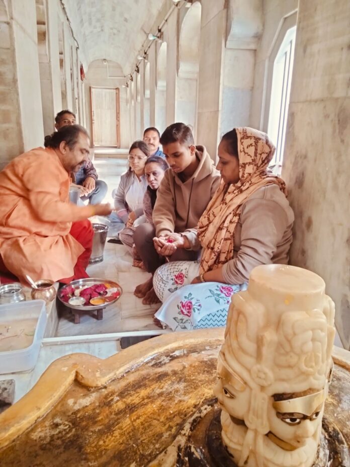 रतलाम। श्री सनातन धर्म सभा रतलाम द्वारा बागड़ो का वास स्थित अगर जी के मंदिर में स्थित प्राचीन श्री चौमुखा महादेव की शिवलिंग के दैनिक अभिषेक योजना गति पकड़ती जा रही है। लगभग प्रतिदिन अब ना कोई शिव भक्त श्रद्धालु के द्वारा अभिषेक किया जा रहा है। इसी कड़ी में आज श्रीमती सपना पति मनोज जोशी निवासी डोंगरे नगर रतलाम ने सपरिवार भगवान श्री चौमुखा महादेव का अभिषेक कर धर्म लाभ लिया गया । अभिषेक विधि पंडित श्री त्रिभुवन गणेश जी पंड्या द्वारा कराई जा रही हैं । इस अवसर पर अभिषेक योजना संयोजक श्री जुगल पंड्या समाज श्री अंकित मिश्रा सहित अनेक भक्तगण उपस्थित थे।