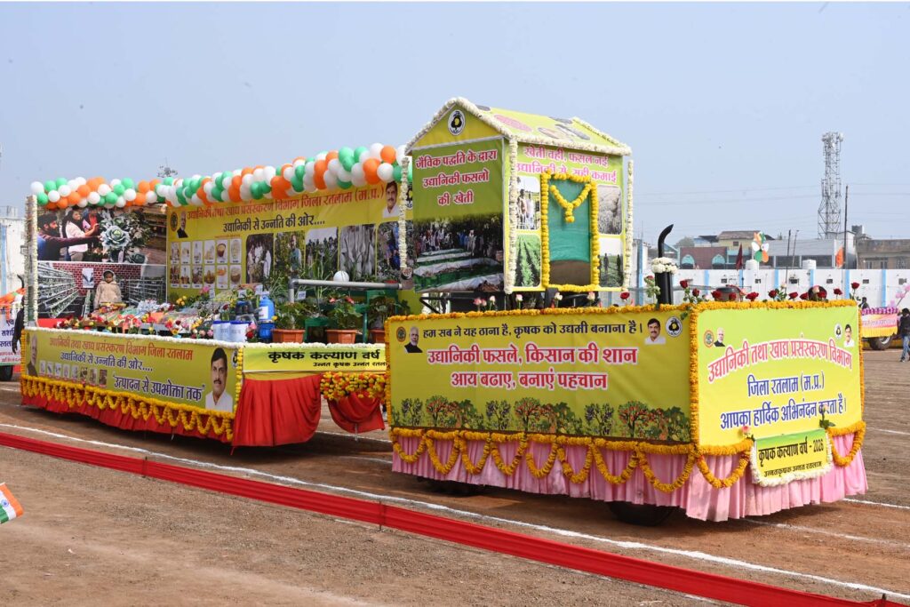 गणतंत्र दिवस समारोह में शासन द्वारा संचालित कल्याणकारी योजनाओं को प्रदर्शित करती झांकियों में राजस्व विभाग, लोक स्वास्थ्य एवं परिवार कल्याण विभाग, किसान कल्याण तथा कृषि विकास विभाग, उद्यानिकी विभाग, पशुपालन एवं डेयरी विभाग, लोक स्वास्थ्य यांत्रिकी विभाग, सहकारिता विभाग, महिला एवं बाल विकास विभाग, मत्स्य पालन विभाग, पंचायत एवं ग्रामीण विकास विभाग, नगर पालिका निगम, सामाजिक न्याय एवं दिव्यांगजन सशक्तिकरण विभाग, जिला शिक्षा केंद्र, यातायात विभाग द्वारा आकर्षक झांकियां निकाली गई। झांकियों में प्रथम पुरस्कार किसान कल्याण एवं कृषि विकास विभाग रतलाम को, द्वितीय पुरस्कार जिला पंचायत तथा तृतीय पुरस्कार उद्यानिकी विभाग को प्राप्त हुआ।