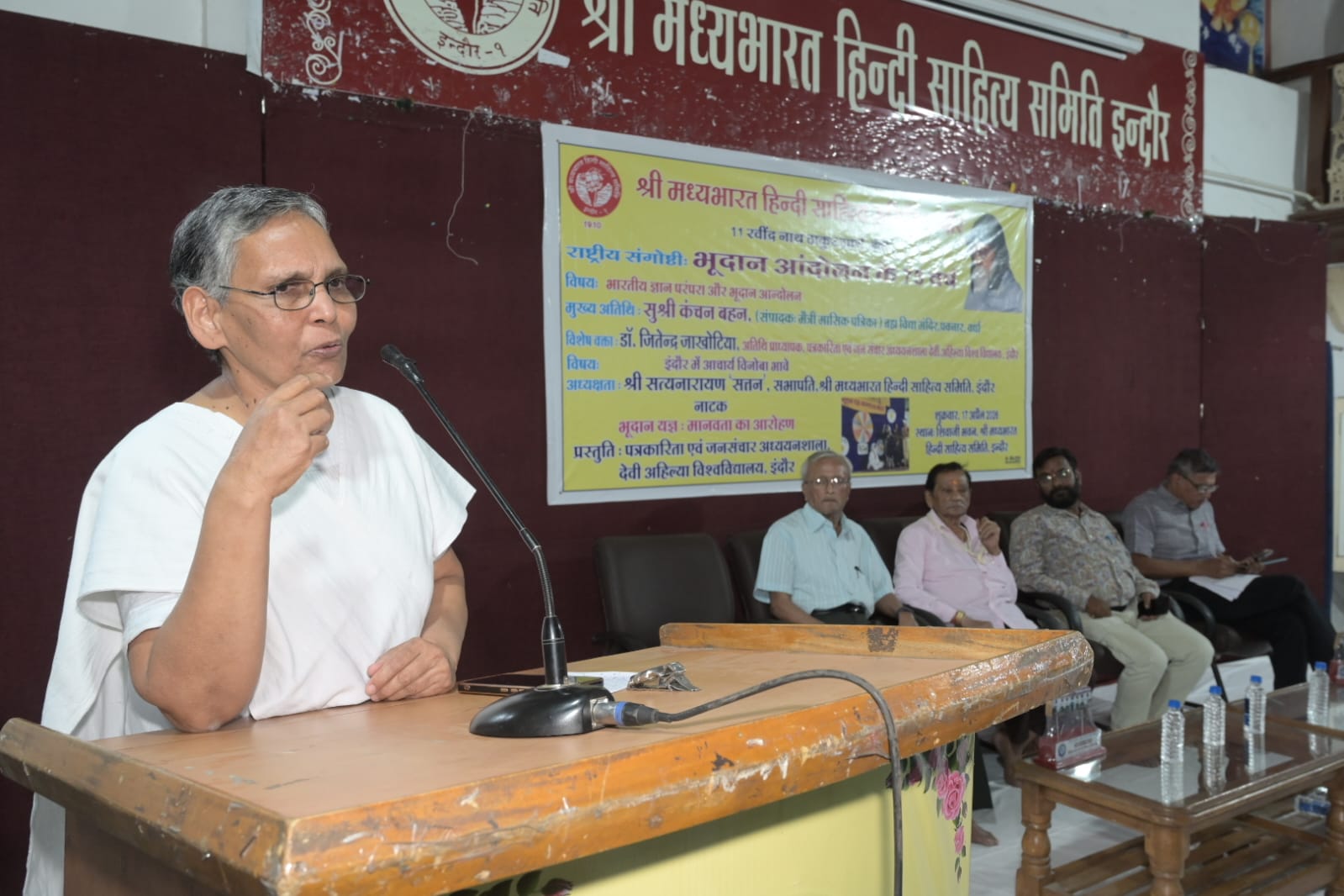 श्री मध्यभारत हिन्दी साहित्य समिति में समसामयिक कार्यक्रम आयोजित किया गया जिसमें ब्रह्मविद्या मंदिर पवनार, वर्धा की सुश्री कंचन बहन ने विनोबा जी के भूदान यज्ञ के साथ भारतीय ज्ञान परम्परा और भूदान आन्दोलन पर अपने सारगर्भित विचार व्यक्त किये। कंचन बहन मूलतः बनारस में जन्मीं, विनोबा जी से प्रभावित होकर असम, उड़ीसा, महाराष्ट्र और अन्य प्रांतों में सर्वोदय के लिये काम किया और आज समिति में उन्होंने विनोबाजी के विचारों को प्रस्तुत करके उनकी यादों को ताजा कर दिया। कंचन बहन ने कहा कि विनोबाजी सर्वे भवन्तु सुखिनः तथा सबै भूमि गोपाल की इनको मूर्तरुप दिया, उनका कहना था कि भारत को अपने अध्यात्म के साथ आधुनिक विज्ञान को भी जोड़ना पड़ेगा। जिस देश में महाभारत का उदाहरण, सुई की नोंक बराबर भूमि न देने पर महाभारत हुआ हो, उसी देश में संत विनोबा भावे को हजारों एकड़ की भूमि स्वेच्छा से लोगों ने प्रदान की, जिसमें सिर्फ अमीर लोग ही नहीं रहे बल्कि वो गरीब किसान भी थे जिनके मन में सबको साथ लेकर चलने की भावना थी। विनोबाजी कहते थे कि दान करो मगर मदद की भावना से नहीं, दया की भावना से नहीं बल्कि संग्रह के विभाजन को महत्व देते हुये। कंचन बहन ने विनोबा जी से जुड़े भूदान यज्ञ के साथ डाकुओं द्वारा आत्मसमर्पण के भी मार्मिक प्रसंग सुनाये एवं बताया कि उनका प्रभाव पूर्वी पाकिस्तान में भी कितना पड़ा कि वहाँ भी लोगों ने अपनी जमीनें लोगों को दान की। जब उनकी यात्रा के समय जय पाकिस्तान के नारे लगाये तो विनोबाजी ने जय जगत का नारा लगाया और आज वह समाज के लिए महामंत्र बन गया। उनका कहना था कि समाज की समस्या कोई एक व्यक्ति या शासन नहीं सुलझा सकता, समाज को ही अपनी समस्या का निराकरण करना होगा। कार्यक्रम की अध्यक्षता करते हुए श्री सत्यनारायण सत्तन ने कहा कि भारतीय इतिहास में सबसे पहला भूदान का प्रसंग राजा बलि और विष्णु के प्रसंग से जुड़ता है। हमारे आध्यात्मिक चेतना का उद्देश्य रहा कि सभी लोग सुखी हो। देवी अहिल्या विश्वविद्यालय के पत्रकारिता एवं जनसंचार अध्ययनशाला के प्राध्यापक डॉ. जितेन्द्र जाखेटिया ने 1960 में इंदौर में एक माह तक रहे। विनोबाजी की यादों और उनके कार्यों का स्मरण दिलाया और बताया कि भूदान आंदोलन 18 अप्रैल, 1951 को उन्होंने शुरु किया था। विनोबाजी की इंदौर यात्रा के समय, इंदौर शहर भी एक गंदे शहरों में गिना जाता था। विनोबाजी ने भारत स्वच्छता अभियान इंदौर से ही शुरु किया था और उसका सुखद परिणाम आज हम सब लोगों को देखने को मिल रहा है।
